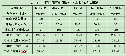 總之,¢4.2×13m聯(lián)合粉磨系統(tǒng)、水泥磨二倉(cāng)改用陶瓷研磨體,進(jìn)行的PC 32.5和PO 42.5水泥生產(chǎn)試驗(yàn),盡管是初步試驗(yàn),盡管臺(tái)時(shí)產(chǎn)量有所下降,已經(jīng)取得了明顯的節(jié)電效果,初步試驗(yàn)的總體情況見表01-02。