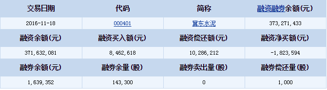 冀東水泥(000401)2016-11-18融資融券信息顯示,冀東水泥融資余額371,632,081元,融券余額1,639,352元,融資買(mǎi)入額8,462,618元,融資償還額10,286,212元,融資凈買(mǎi)額-1,823,594元,融券余量143,300股,融券賣(mài)出量0股,融券償還量1,000股,融資融券余額373,271,433元。冀東水泥融資融券詳細(xì)信息如下表: