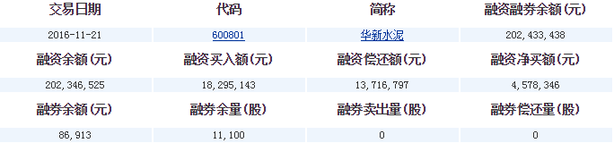 華新水泥(600801)2016-11-21融資融券信息顯示,華新水泥融資余額202,346,525元,融券余額86,913元,融資買入額18,295,143元,融資償還額13,716,797元,融資凈買額4,578,346元,融券余量11,100股,融券賣出量0股,融券償還量0股,融資融券余額202,433,438元。華新水泥融資融券詳細(xì)信息如下表: