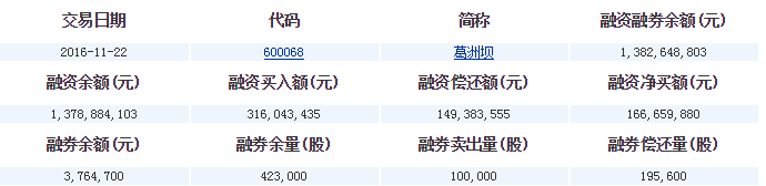 葛洲壩(600068)2016-11-22融資融券信息顯示,葛洲壩融資余額1,378,884,103元,融券余額3,764,700元,融資買入額316,043,435元,融資償還額149,383,555元,融資凈買額166,659,880元,融券余量423,000股,融券賣出量100,000股,融券償還量195,600股,融資融券余額1,382,648,803元。葛洲壩融資融券詳細(xì)信息如下表: