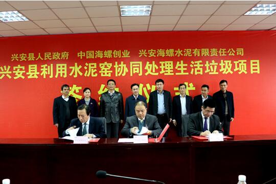 近日,海螺創(chuàng)業(yè)與興安縣人民政府正式簽署《利用水泥窯協(xié)同處理生活垃圾項目投資協(xié)議》。該項目日處理能力達300噸/天,力爭一年建成投運。