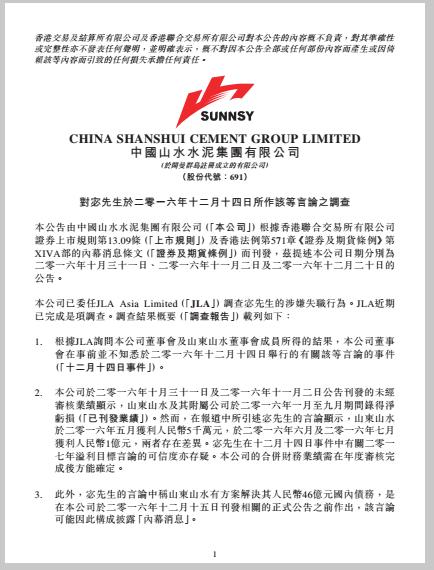 山水水泥1月13日公布,已委任JLA Asia Limited調(diào)查宓敬田的涉嫌失職行為,JLA近期已完成調(diào)查。根據(jù)JLA詢問公司董事會(huì)及山東山水董事會(huì)成員所得的結(jié)果,公司已通過董事會(huì)決議授權(quán)及指示公司的全資附屬公司China Pioneer Cement (Hong Kong) Company Limited,以其作為山東山水的唯一股東通過決議,自2017年1月12日起即時(shí)免除宓敬田在山東山水及其所有附屬公司的所有職務(wù)、權(quán)力及職責(zé),包括其山東山水的董事職務(wù)及副董事長(zhǎng)職務(wù),以及免除宓敬田與公司、附屬公司及其關(guān)聯(lián)公司的所有雇傭關(guān)系。