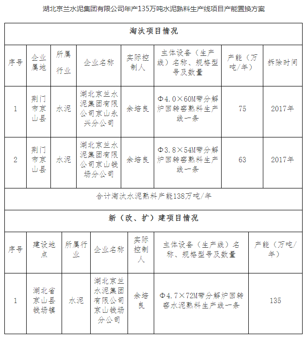 附:湖北京蘭水泥集團有限公司年產(chǎn)135萬噸水泥熟料生產(chǎn)線項目產(chǎn)能置換方案