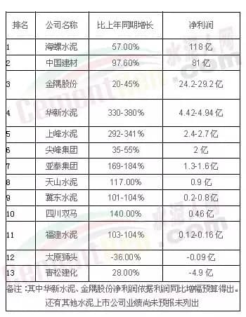 2016年水泥行業(yè)凈利潤(rùn)排行表