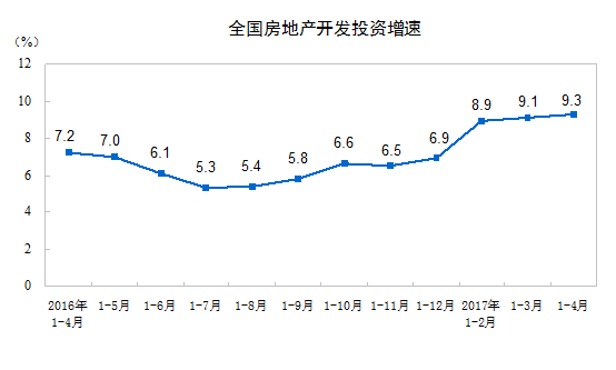 2017年1-4月份,全國(guó)房地產(chǎn)開發(fā)投資27732億元,同比名義增長(zhǎng)9.3%,增速比1-3月份提高0.2個(gè)百分點(diǎn)。其中,住宅投資18671億元,增長(zhǎng)10.6%,增速回落0.6個(gè)百分點(diǎn)。住宅投資占房地產(chǎn)開發(fā)投資的比重為67.3%。