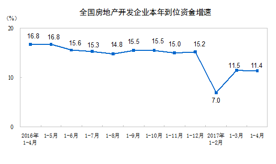 1-4月份,房地產(chǎn)開發(fā)企業(yè)到位資金47221億元,同比增長(zhǎng)11.4%,增速比1-3月份回落0.1個(gè)百分點(diǎn)。其中,國(guó)內(nèi)貸款8774億元,增長(zhǎng)17.0%;利用外資74億元,增長(zhǎng)115.3%;自籌資金14217億元,下降4.7%;其他資金24156億元,增長(zhǎng)21.3%。在其他資金中,定金及預(yù)收款13842億元,增長(zhǎng)21.7%;個(gè)人按揭貸款7662億元,增長(zhǎng)14.5%。