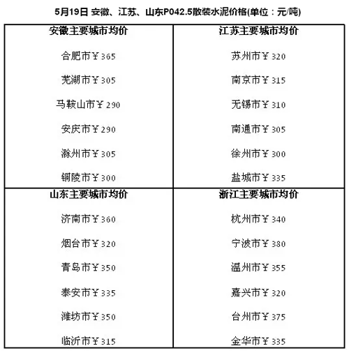 據(jù)了解,長三角沿江熟料價格上漲20元/噸,漲幅達到80-90元/噸,出廠價達320元/噸-340元/噸,這是今年來沿江熟料價格第四次漲價。此輪漲價在市場意料之外,明顯超預(yù)期。由于沿江熟料價格是華東地區(qū)水泥價格的風向標,預(yù)計在今年6月淡季來臨前,安徽、山東、江蘇和浙江的水泥價格有望再跟隨熟料價格普漲一輪。水泥人網(wǎng)匯總了這些地區(qū)的最新價格,匯總?cè)缦拢?/p>