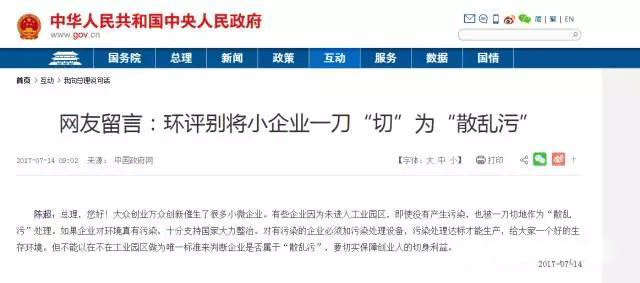陳超:總理,您好!大眾創(chuàng)業(yè)萬眾創(chuàng)新催生了很多小微企業(yè)。有些企業(yè)因為未進入工業(yè)園區(qū),即使沒有產(chǎn)生污染,也被一刀切地作為“散亂污”處理。如果企業(yè)對環(huán)境真有污染,十分支持國家大力整治。對有污染的企業(yè)必須加污染處理設備,污染處理達標才能生產(chǎn),給大家一個好的生存環(huán)境。但不能以在不在工業(yè)園區(qū)做為唯一標準來判斷企業(yè)是否屬于“散亂污”,要切實保障創(chuàng)業(yè)人的切身利益。