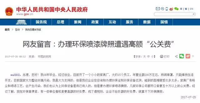 wu0802:總理,您好!我08年畢業(yè),經(jīng)過創(chuàng)業(yè),目前開了一個小小的家具廠,大約15個員工,年營業(yè)額200萬左右,利潤單薄,只能維持生活開支。目前國家大力整治環(huán)境污染,我是大力支持的,但是我們企業(yè)在咨詢和辦理環(huán)保證和環(huán)保設備這塊,碰到的困難疑惑太多太多。家具廠有粉塵和噴漆工藝,會產(chǎn)生污染,我們也認為上環(huán)保設備是利已利人的,但是要辦理環(huán)保噴漆牌照,幾家環(huán)保公司都開口索要五十萬以上的公關(guān)費。經(jīng)過了解,現(xiàn)在環(huán)保查得緊,有一些單位借機索要高額的好處費,成了潛規(guī)則,企業(yè)不給巨額的好處費,就拿不下環(huán)保牌照。