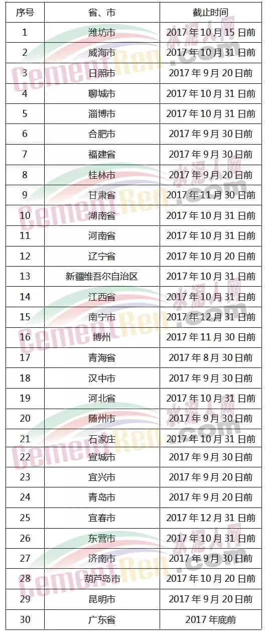 根據(jù)國務(wù)院辦公廳《控制污染物排放許可制實施方案》(國辦發(fā)〔2016〕81號)、環(huán)保部《排污許可證管理暫行規(guī)定》(環(huán)水體〔2016〕186號,以下簡稱《暫行規(guī)定》)和《固定污染源排污許可分類管理名錄》(2017年版)等要求,全國各省、市、區(qū)將對鋼鐵、水泥企業(yè)發(fā)布排污許可證,水泥人網(wǎng)將全國30個省市區(qū)許可證申請時間表整理如下: