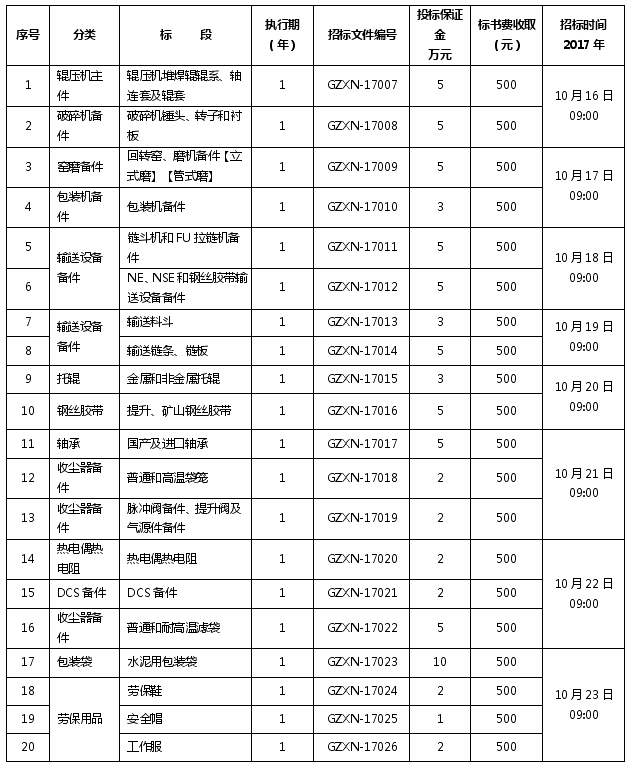 貴州西南水泥有限公司是西南水泥有限公司下屬子公司,于2012年3月21日成立。貴州西南水擬定于2017年10月中旬對下屬26家成員企業(yè)2018年度輔材備件進行集中招標,通過邀請招標選擇資質合格、保供能力強、質量及技術服務均受控的供貨單位?,F(xiàn)將相關招標采購信息發(fā)布如下: