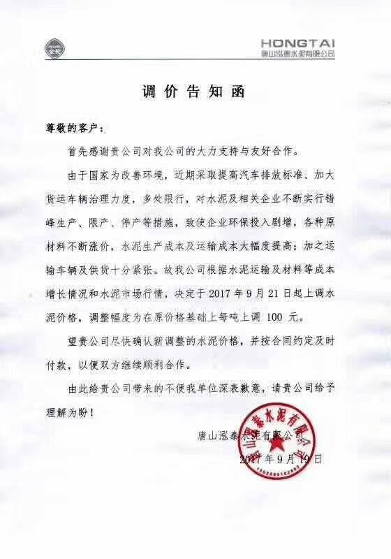 唐山冀東水泥價(jià)格調(diào)整告知函稱:近期受國(guó)家加強(qiáng)大氣污染治理影響,貨物運(yùn)輸車輛排放標(biāo)準(zhǔn)上調(diào),貨物運(yùn)輸受限明顯,交通運(yùn)輸費(fèi)用大幅上漲,造成石灰石、礦渣等原材料價(jià)格也大幅上揚(yáng),同時(shí)受國(guó)家供給側(cè)改革持續(xù)推進(jìn),水泥企業(yè)錯(cuò)峰生產(chǎn)成為長(zhǎng)效機(jī)制影響,水泥生產(chǎn)成本大幅增加,企業(yè)經(jīng)營(yíng)困難 ,為保證企業(yè)良性發(fā)展,持續(xù)為客戶提供優(yōu)質(zhì)產(chǎn)品和良好服務(wù),根據(jù)當(dāng)前市場(chǎng)情況,自2017年9月22日起將水泥價(jià)格上調(diào)100元/噸。