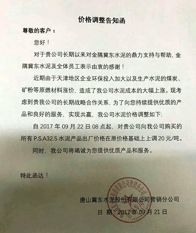 企業(yè)價(jià)格調(diào)整告知函稱:由于天津地區(qū)企業(yè)環(huán)保投入加大以及生產(chǎn)水泥的煤炭、礦粉等原燃材料漲價(jià),造成了水泥成本的大幅上漲。