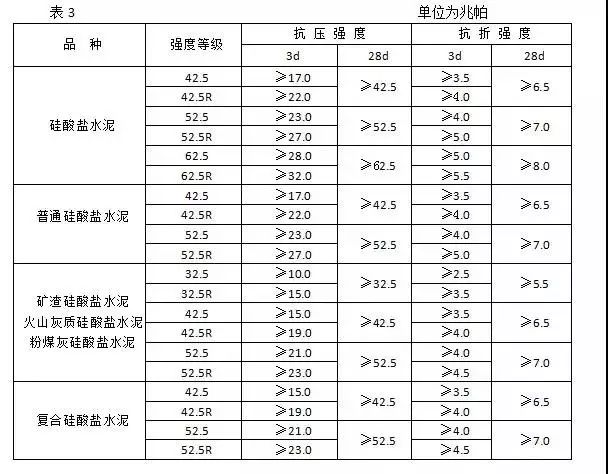 不同品種不同強度等級的通用硅酸鹽水泥,其不同齡期的強度應(yīng)符合表3的規(guī)定。