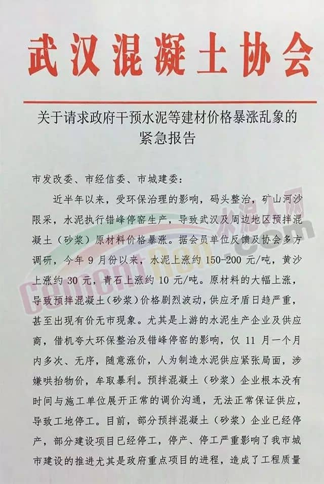 報(bào)告稱,近半年以來(lái),受環(huán)保治理的影響,碼頭整治、礦山河沙限采,水泥執(zhí)行錯(cuò)峰停窯生產(chǎn),導(dǎo)致武漢及周邊地區(qū)預(yù)拌混凝土(砂漿)原材料價(jià)格暴漲。