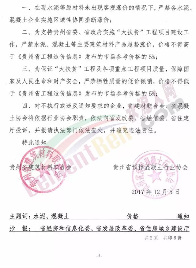 昨日(5日)貴州省建筑材料聯(lián)合會(huì),貴州省預(yù)拌混凝土行業(yè)協(xié)會(huì)發(fā)布《關(guān)于響應(yīng)和支持貴州實(shí)施”大扶貧“戰(zhàn)略攻堅(jiān)階段的工作精神,嚴(yán)禁水泥、混凝土等主要建材產(chǎn)品嚴(yán)重高于《貴州省工程造價(jià)信息》市場(chǎng)參考價(jià)格銷售的通知。通知稱:省建材聯(lián)合會(huì)、省混凝土協(xié)會(huì)為積極響應(yīng)和支持貴州省委、省政府實(shí)施“大扶貧、大數(shù)據(jù)、大生態(tài)”三大戰(zhàn)略精神,特別是“大扶貧”戰(zhàn)略處于攻堅(jiān)階段關(guān)鍵時(shí)期,水泥、混凝土等主要建筑材料在“大扶貧”工作中的作用及影響極大,由于近期部分地區(qū)“大扶貧”項(xiàng)目開工率較高,水泥等企業(yè)有協(xié)同壟斷漲價(jià)之嫌,省建材聯(lián)合會(huì)、省混凝土協(xié)會(huì)站在講政治、講大局的高度,依據(jù)《中華人民共和國(guó)反壟斷法》相關(guān)規(guī)定通知各水泥‘混凝土企業(yè)依法經(jīng)營(yíng),嚴(yán)禁實(shí)施違法壟斷漲價(jià)行為。