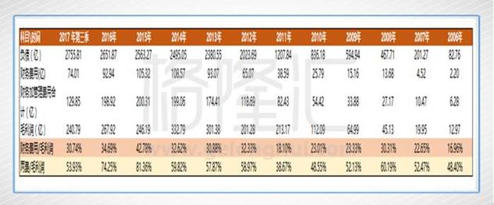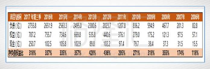 從上圖來看,資產(chǎn)負(fù)債率近年來一直在下降,絕對值雖高但卻感受不到異常,2017年第三季這數(shù)據(jù)更下降到77.78%。十年前,這一數(shù)字還停留在118%,十年后則完全超過320%,提升幅度超過2倍,鬼知道它經(jīng)歷了什么。最高峰還去到不可思議的430%以上,還連續(xù)保持了兩個會計年度,這種“神技”也許只有央企才能做得出來。