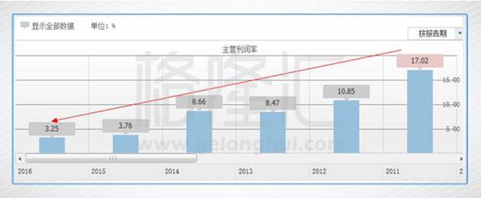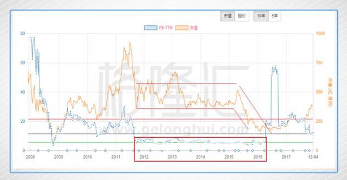 在2011年末至2014年末,中國建材的平均市盈率保持在4-5倍之間,表明上看起來很便宜,實(shí)際上是一個“價值陷阱”。2015年期間在這樣的估值基礎(chǔ)下,中國建材下跌幅度竟超過65%,究其原因,2015年及2016年的凈利潤不足30億,對比2012年-2014年年度平均凈利潤跌幅超2/3,再往深挖,造成凈利潤大跌50-60億級別主要原因在于毛利率的下跌,而財務(wù)費(fèi)用、管理費(fèi)用等巨額固定支出依然不減,致使上述兩費(fèi)占毛利比由2014年的59.82%大幅上升至2015年的81.36%及2016年的74.25%。