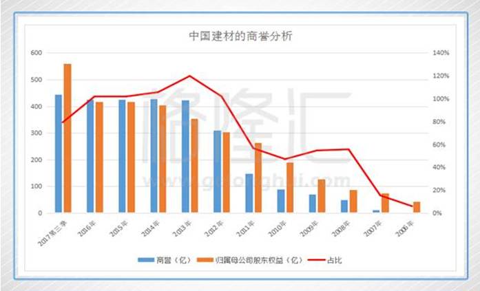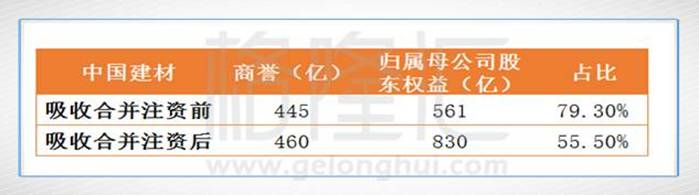 二、中國建材引人注目的地方除了高額的利息支出及固定支出外,其龐大的商譽(yù)的存在一直被市場人士咎病。2008-2011年商譽(yù)所占?xì)w屬母公司公司權(quán)益超過50%,比2007-2006年度上了何止一個臺階。2012-2016年年度這個數(shù)據(jù)又比2008-2011年度再翻了一番,達(dá)到驚人的100%以上(峰值為2013年的119.83%),換言之,合并報表的商譽(yù)的數(shù)額一項(xiàng)完全超過了歸屬母公司股東權(quán)益的數(shù)值。如今最新一期報表顯示的商譽(yù)為445億,假若未來若碰上符合商譽(yù)減值測試的事件,每變動5%,則相關(guān)減值影響超過22億,而2016年年末的凈利潤數(shù)據(jù)僅為28億左右。(單從會計口徑角度思考)中國建材背著如此龐大的商譽(yù)資產(chǎn)彷如背著“定時炸彈”。