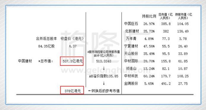 吸收合并中材股份后的中國建材的總股本為84.35億股,按照12月6日最新的收盤價6.37港元可知其重組后的總市值為537.3億港元,而其參股控股的主要A股上市公司合計持股市值為513.3億港元,若按照最新的AH溢價指數(shù)來“轉(zhuǎn)換”這部分市值來參考可得到378億港元,兩者的差額為135.3億港元。