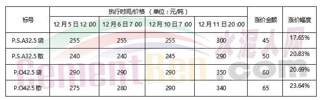 福建金牛水泥有限公司進(jìn)入12月份已陸續(xù)幾次發(fā)布提價(jià)通知,全面調(diào)整各區(qū)域出貨價(jià)格。各品種水泥上調(diào)幅度在20-40元/噸左右。