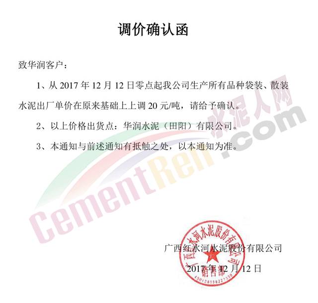 昨日(12日)廣西紅水河水泥股份有限公司發(fā)布調(diào)價(jià)確認(rèn)函稱,從零點(diǎn)起所有品種水泥出廠單價(jià)在原基礎(chǔ)上上調(diào)20元/噸。