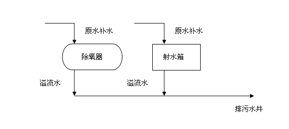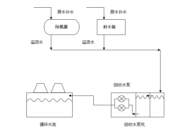 甘肅金泥集團(tuán)有限責(zé)任公司干法二廠余熱電站總投資2800萬(wàn)元,投產(chǎn)以來(lái)每年新增利潤(rùn)數(shù)萬(wàn)元,節(jié)約標(biāo)準(zhǔn)煤1.074萬(wàn)噸,減排二氧化碳2.58萬(wàn)噸。該余熱電站將原水通過(guò)活性炭過(guò)濾器及多介質(zhì)過(guò)濾器降低水體的濁度、除去懸浮雜質(zhì)、凈化水質(zhì),再經(jīng)過(guò)反滲透系統(tǒng)除去水中的微粒、有機(jī)物質(zhì)、膠體物和無(wú)機(jī)的陽(yáng)離子、陰離子等水中雜質(zhì),進(jìn)而得到除鹽水,再由物理除氧方式將其中氧氣剝離打進(jìn)鍋爐,經(jīng)高溫廢氣加熱至過(guò)熱蒸汽帶動(dòng)汽輪發(fā)電機(jī)做功發(fā)電,做功后的蒸汽再經(jīng)過(guò)循環(huán)水冷凝除氧進(jìn)入鍋爐,如此往復(fù)形成一個(gè)汽水循環(huán)。要保證其穩(wěn)定運(yùn)行,就需要將其中每一個(gè)環(huán)節(jié)做得一絲不茍,但面對(duì)北方水質(zhì)偏硬的現(xiàn)實(shí)問(wèn)題,為了將循環(huán)水的硬度降至標(biāo)準(zhǔn)值不得不加大補(bǔ)水排污量,可是這樣又造成了不必要的水資源浪費(fèi),故對(duì)余熱電站內(nèi)除氧器及射水箱的工業(yè)補(bǔ)水溢流水進(jìn)行了下圖所示的回收水系統(tǒng)改造。