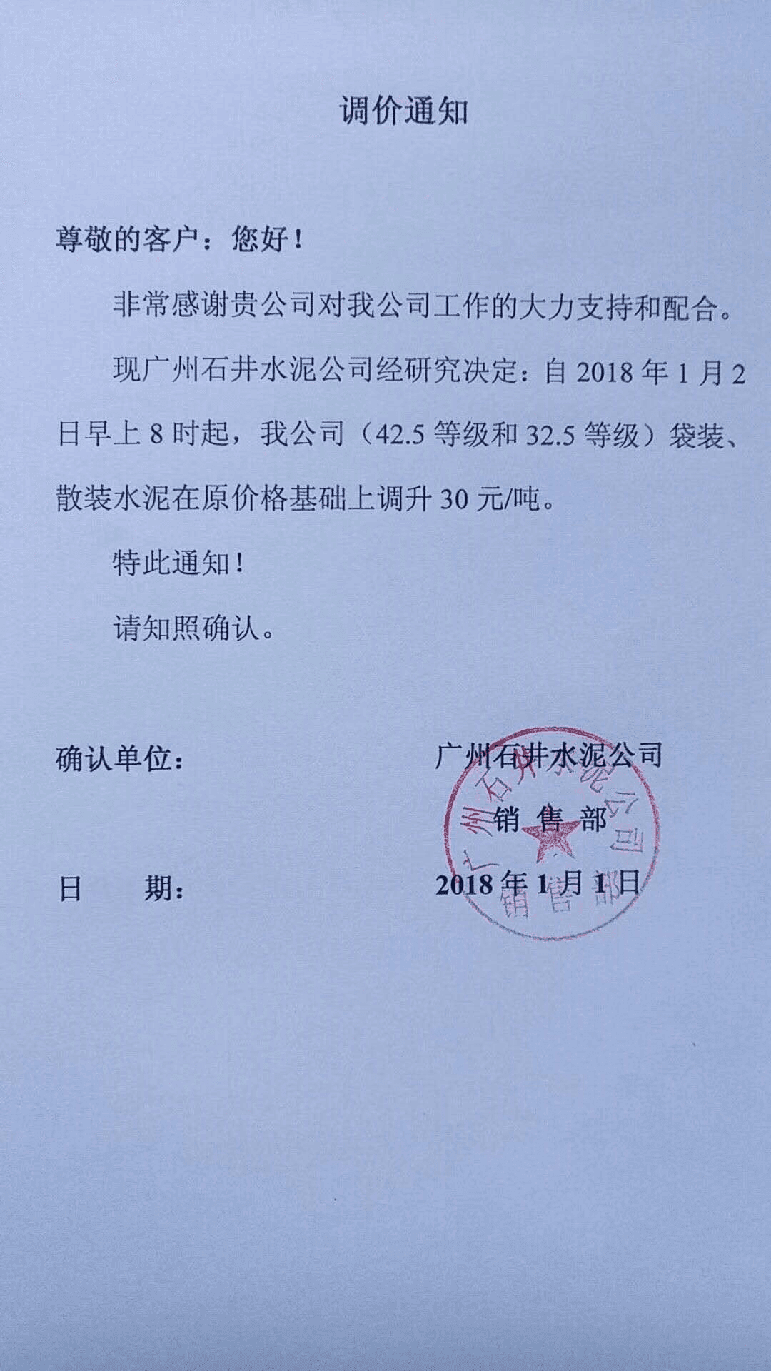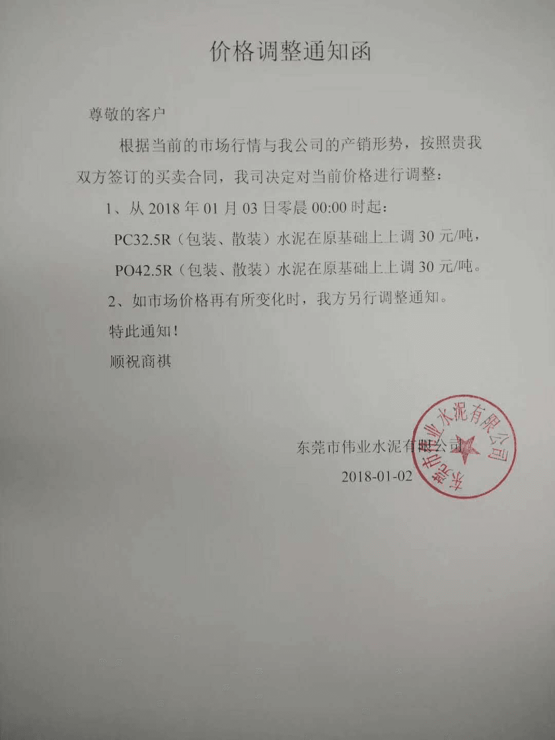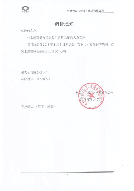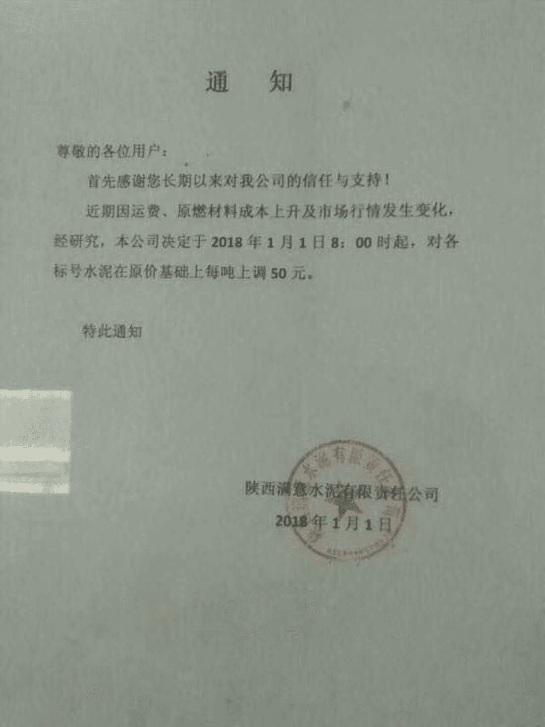 除此之外,據(jù)水泥人網(wǎng)了解,陜西地區(qū)在2017年年末也進(jìn)行了最后一輪漲價,并且因受到錯峰生產(chǎn)、環(huán)保督查等方面的影響,目前陜西部分地區(qū)水泥企業(yè)已無熟料可賣。部分漲價函如下: