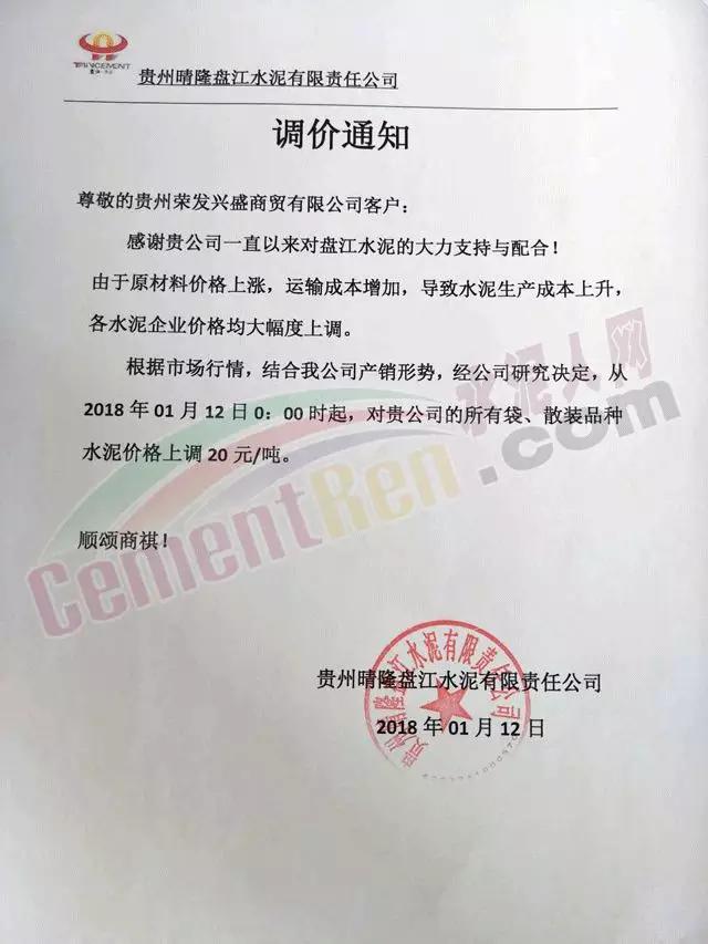 通知,根據(jù)當(dāng)前限電情況、市場(chǎng)形勢(shì)及我公司產(chǎn)銷情況,經(jīng)公司研究決定,2018年1月17日12點(diǎn)對(duì)P.C32.5、P.O42.5、P.O52.5散裝水泥價(jià)格分別上調(diào)30元/噸,感謝您長(zhǎng)期以來(lái)對(duì)貴陽(yáng)海螺的支持與惠顧。