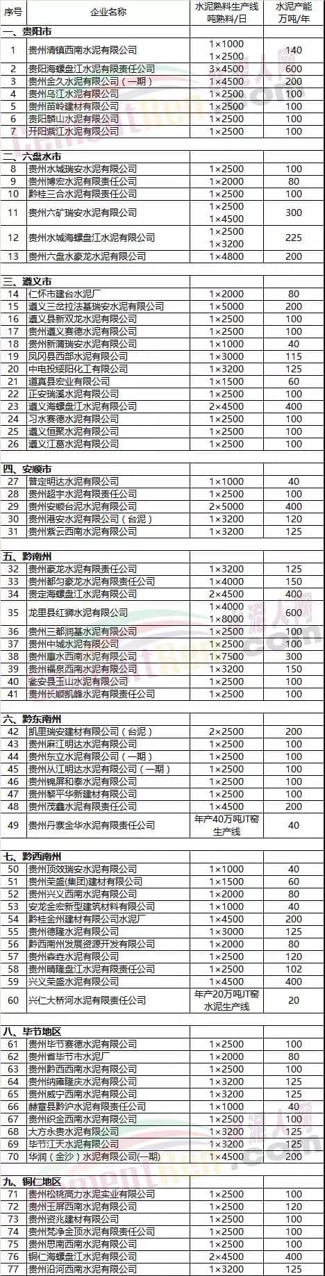 貴州省水泥行業(yè)產(chǎn)能現(xiàn)狀清單