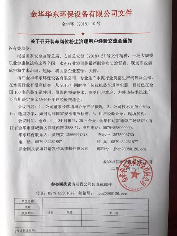 浙江金華華東環(huán)保設(shè)備有限公司,專業(yè)生產(chǎn)水泥行業(yè)旋窯生產(chǎn)線袋除塵器,在水泥行業(yè)有很高信譽(yù),2015年開始生產(chǎn)裝載機(jī)裝車道除塵器,目前 已在全國100多條裝車道使用,屬國內(nèi)領(lǐng)先技術(shù),深受用戶歡迎,為使該 技術(shù)迅速廣泛應(yīng)用決定在金華召開用戶經(jīng)驗(yàn)交流會(huì)。