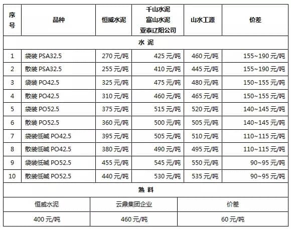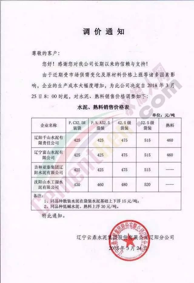 3月24日,遼寧云鼎水泥集團股份有限公司遼陽分公司發(fā)布調(diào)價通知稱自2018年3月25日8點起對水泥熟料價格進行調(diào)整:具體執(zhí)行價格如下。