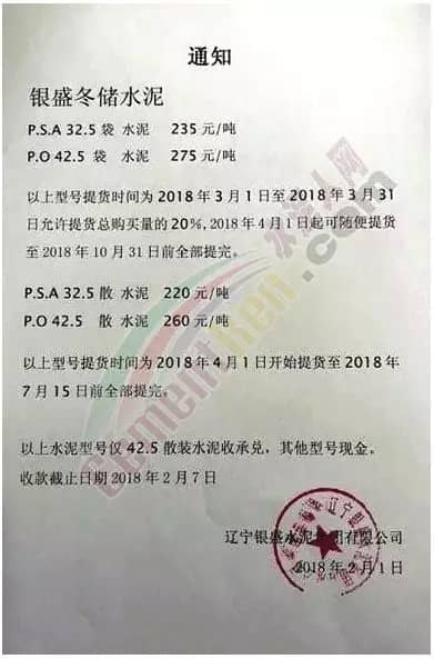 4月1日,遼寧云鼎集團股份有限公司沈陽分公司發(fā)布提價,由于近期市場供需變化,原材料價可靠上漲,企業(yè)的生產(chǎn)成本大幅增加,公司決定自2018年4月1日8點起,亞泰集團鐵嶺水泥有限、遼寧山水工源水泥有限公司、遼寧交通水泥有限公司、吉林亞泰集團(遼寧)建材有限公司沈北分公司、亞泰集團調(diào)兵山水泥有限公司的預(yù)付款、各品種水泥在預(yù)收價格基礎(chǔ)上上調(diào)30元/噸。