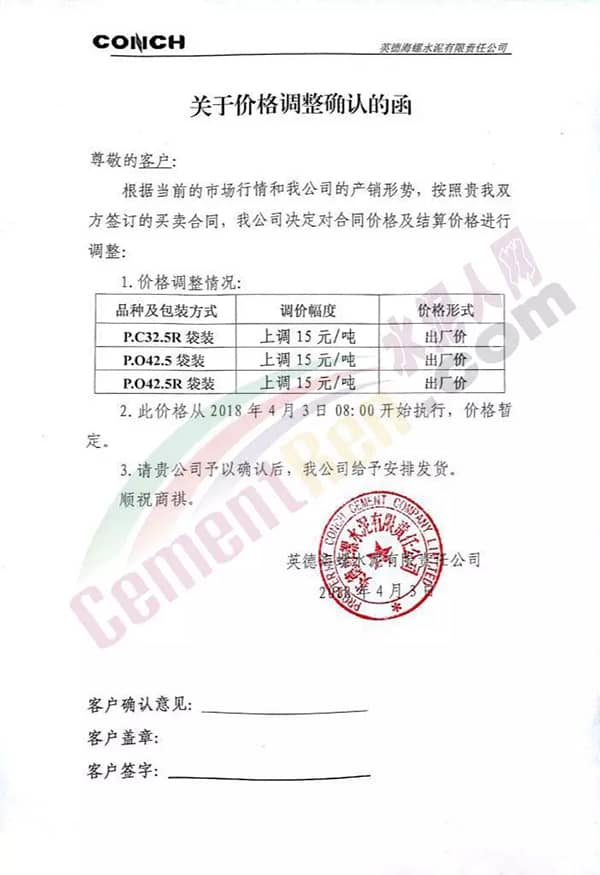 寧波海螺水泥調(diào)價(jià)通知