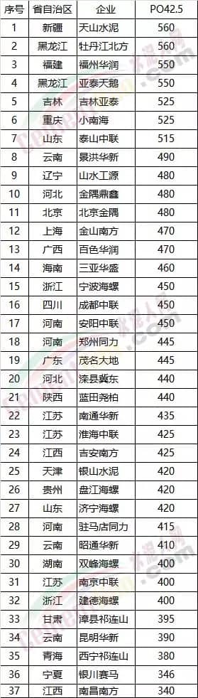 1 42.5水泥報(bào)價(jià)單位 元/噸