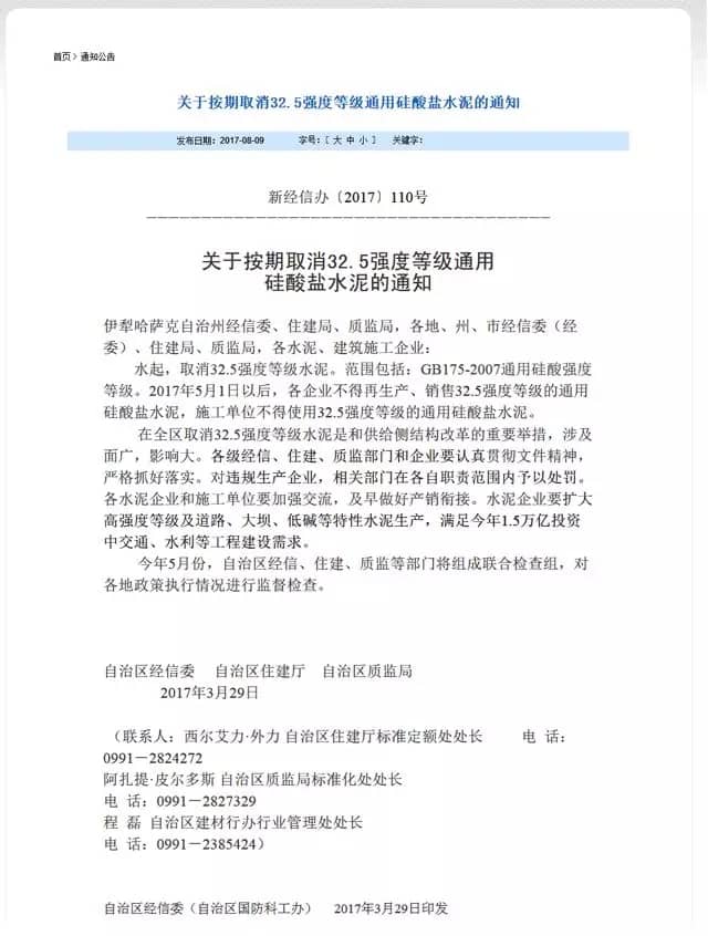 新疆自2017年5月1日起,全面停止生產(chǎn)、銷售32.5強度等級的通用硅酸鹽水泥,施工單位不得使用32.5強度等級的通用硅酸鹽水泥。