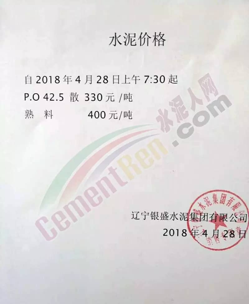 同期發(fā)布水泥最新執(zhí)行價(jià)格的遼寧銀盛集團(tuán)自4月28日早7點(diǎn)30分起PO42.5散裝水泥執(zhí)行330元/噸,熟料執(zhí)行400元/噸。