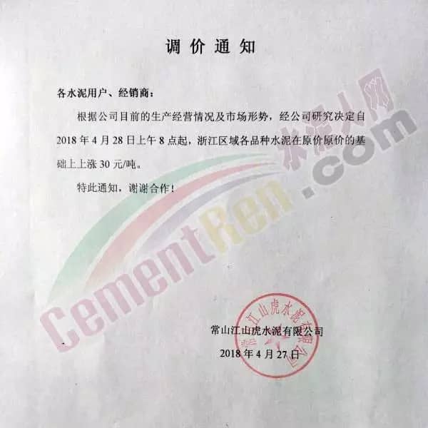 常山江山虎水泥有限公司發(fā)布通知稱自4月28日上午8點(diǎn)起,浙江區(qū)域各品種水泥在原價(jià)基礎(chǔ)上上漲30元/噸。