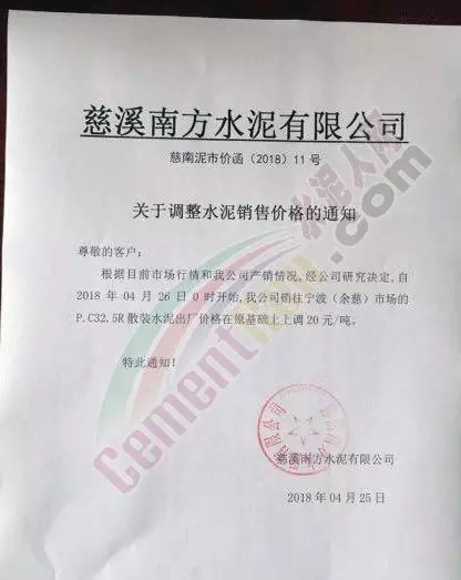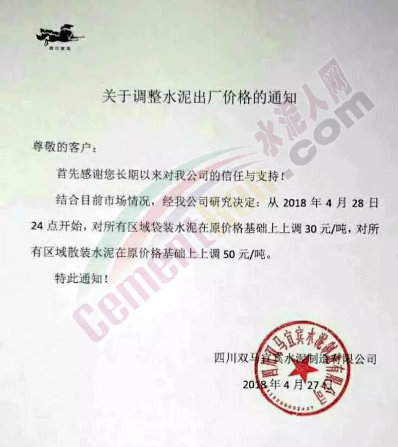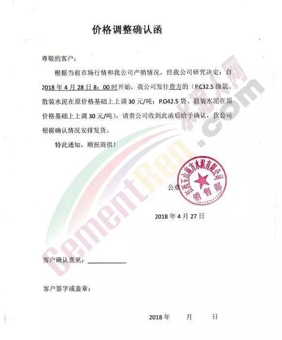 根據(jù)當(dāng)前市場形勢(shì)及我司生產(chǎn)情況,我公司決定于2018年4月27日上午8:00上調(diào)各品種袋裝、散裝水泥20元/噸,價(jià)格上調(diào)以我司出廠過磅時(shí)間為準(zhǔn),如您繼續(xù)安排提貨,則視為認(rèn)同此次價(jià)格調(diào)整。順祝商祺!