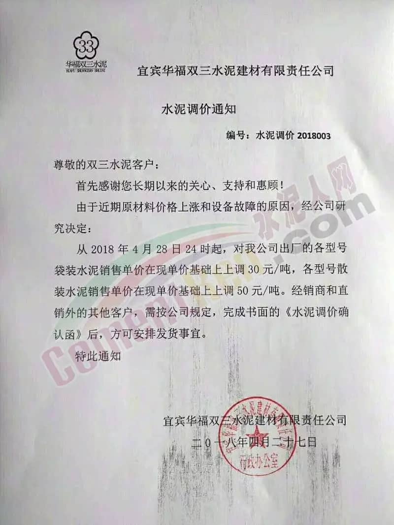 宜賓華福雙三水泥建材有限公司水泥調(diào)價(jià)通知稱,因近期原材料價(jià)格上漲和設(shè)備故障的原因,公司研究決定自4月28日24時(shí)起,對(duì)公司出廠的各型號(hào)袋裝水泥上調(diào)30元/噸,散裝水泥上調(diào)50元/噸。