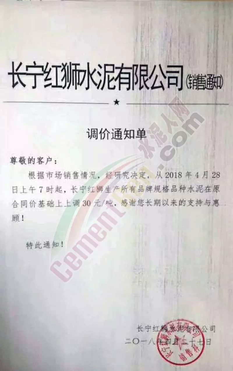 長寧紅獅水泥通知4月28日上午7點(diǎn)各品種水泥上調(diào)30元/噸。