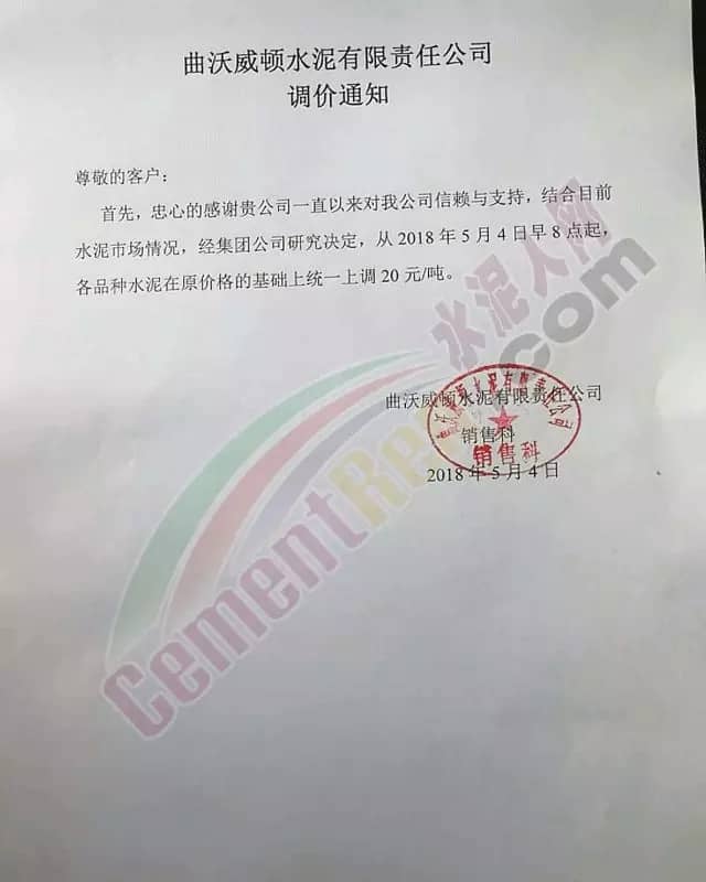 水泥人網(wǎng)5月4日消息,山西南部地區(qū)(晉南)多家企業(yè)通知下游客戶各標(biāo)號(hào)水泥在原價(jià)格基礎(chǔ)上上調(diào)20元/噸。