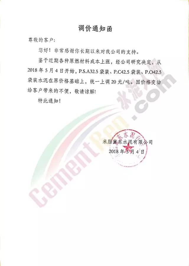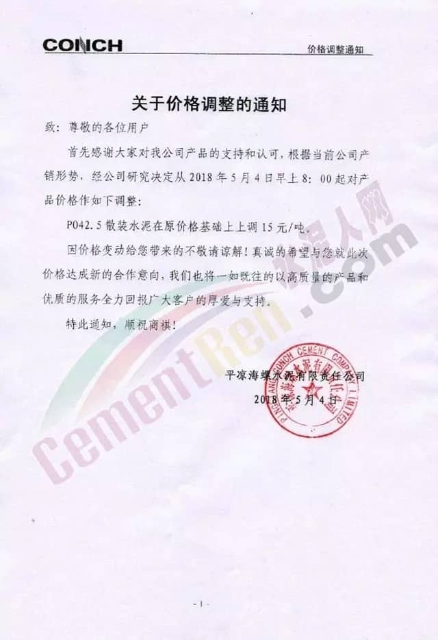 同期,甘肅平?jīng)龊B菟嗤ㄖ掠慰蛻?,根?jù)當(dāng)前公司的產(chǎn)銷形勢(shì),PO42.5散裝水泥在原價(jià)基礎(chǔ)上上調(diào)15元/噸。