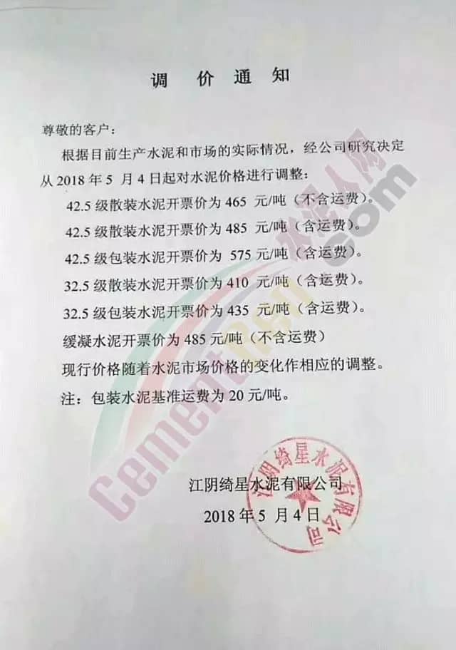 江陰綺星水泥有限公司5月4日調(diào)價(jià)通知顯示 ,42.5級(jí)袋裝水泥開(kāi)票價(jià)為575元/噸(含運(yùn)費(fèi))。 據(jù)查詢,江陰綺星水泥有限公司位于江蘇省江陰市云亭鎮(zhèn)綺山,為單體粉磨站企業(yè),關(guān)鍵設(shè)備為Φ3.8×13m水泥磨1臺(tái)。