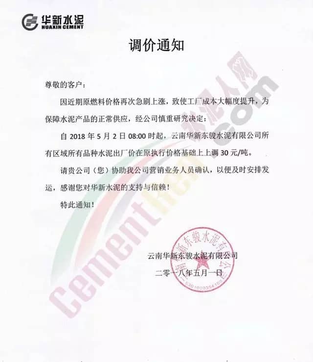 據(jù)水泥人網(wǎng)了解,自5月1日以來(lái),大昆明區(qū)域,華新水泥、昆鋼嘉化等多家水泥企業(yè)通知上調(diào)水泥價(jià)格,漲幅在30元/噸。