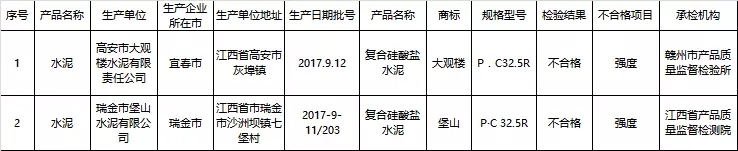 2018年1月31日江西省質(zhì)量技術(shù)監(jiān)督局發(fā)布了關(guān)于2017年水泥等4種產(chǎn)品質(zhì)量省級監(jiān)督專項抽查情況的通報,共抽查了145家企業(yè)生產(chǎn)的145批次產(chǎn)品,重點檢驗了細度/比表面積、初凝時間、終凝時間、安定性、三氧化硫、氧化鎂、燒失量、氯離子、不溶物、水溶性鉻、強度等項目。抽查合格率為98.6%;檢出2批次產(chǎn)品不合格,不合格產(chǎn)品檢出率為1.4%,存在的主要問題是強度指標不符合標準規(guī)定要求。