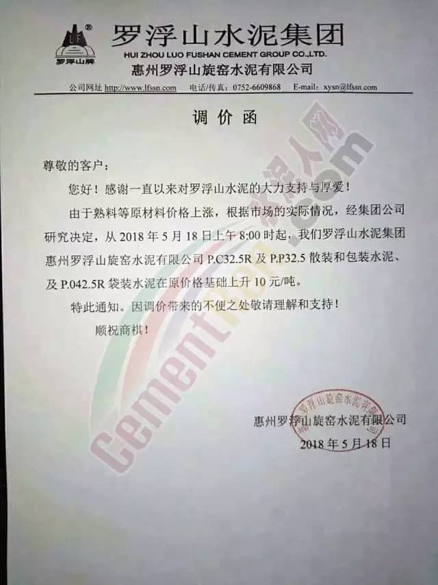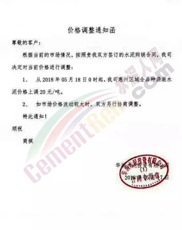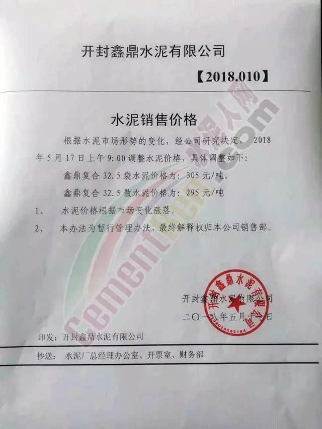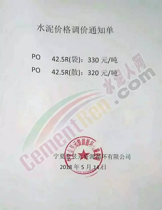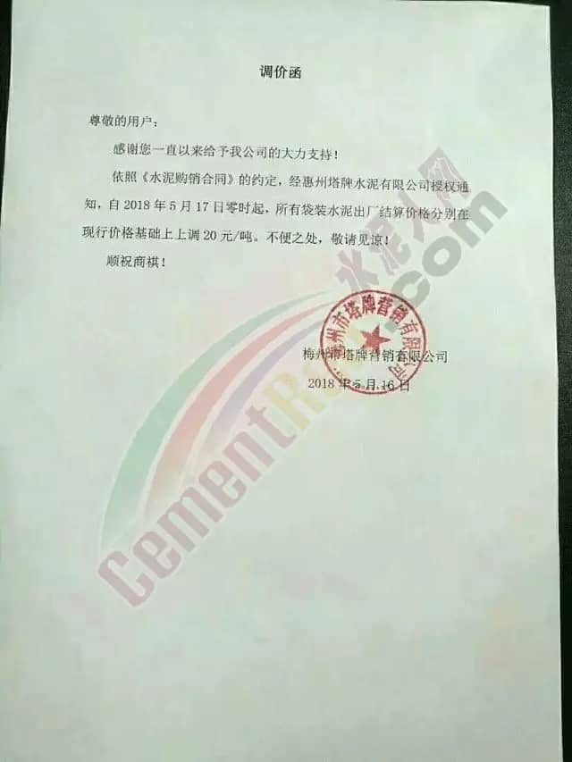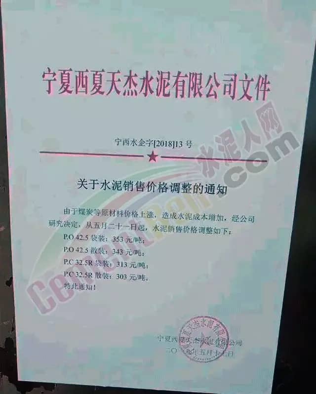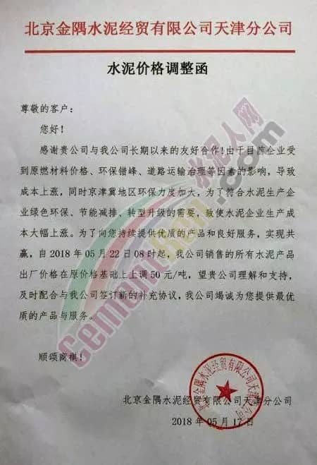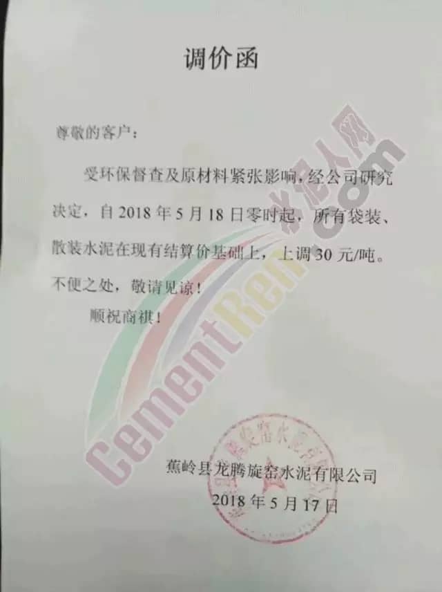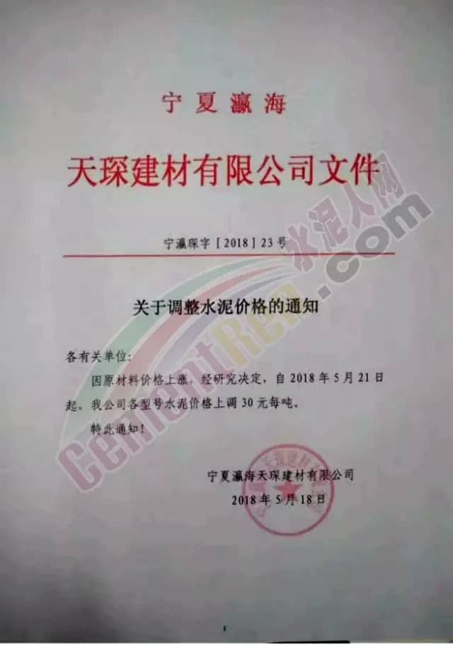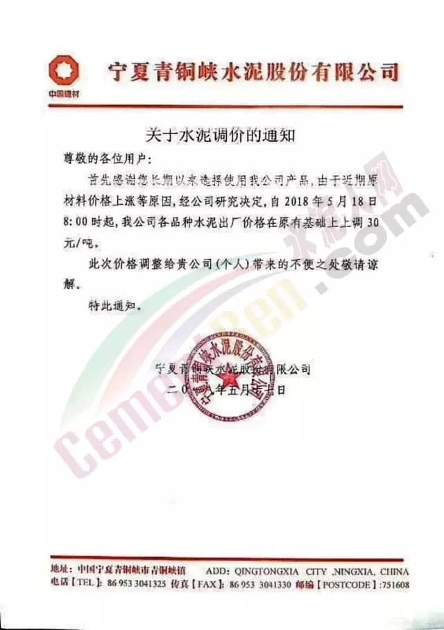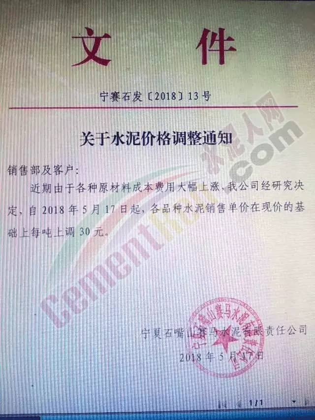 寧夏賽馬水泥關(guān)于調(diào)整水泥銷售價(jià)格的通知稱:因原材料價(jià)格上漲,自2018年5月17日起所有品種規(guī)格水泥價(jià)格上調(diào)30元/噸。其他水泥企業(yè)調(diào)價(jià)通知調(diào)價(jià)原來與此類似。