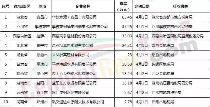十家水泥企業(yè)2018年第一季度繳納環(huán)保稅款