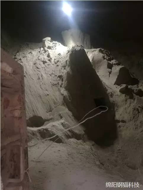 施工企業(yè)先利用四川綿陽(yáng)鋼貓公司移庫(kù)設(shè)備降低庫(kù)容,再利用清庫(kù)設(shè)備清出掛壁料,解除了水泥大面積板結(jié)的險(xiǎn)情