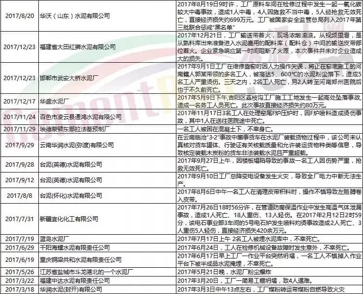 2017年水泥人網(wǎng)曾報(bào)道過(guò)的與水泥企業(yè)安全生產(chǎn)相關(guān)的事故共17起,詳情如下: